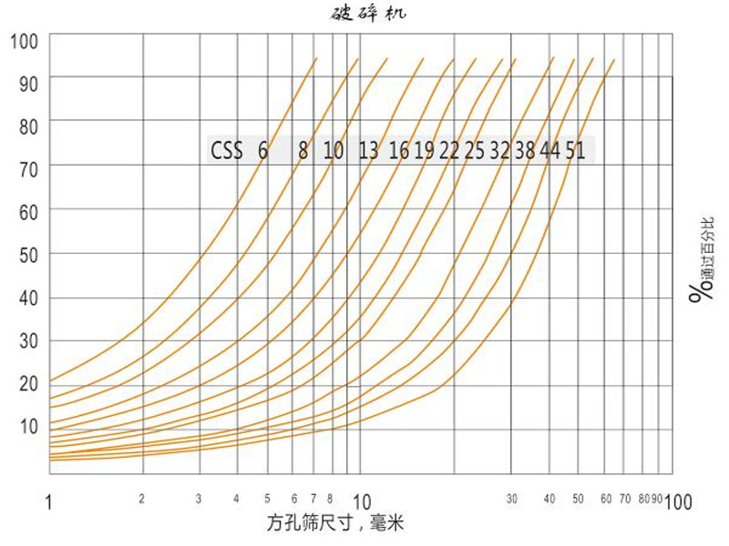 產(chǎn)品粒度曲線和小于緊邊排礦口(方孔,毫米)的破碎產(chǎn)品百分比,與物料的破碎功指數(shù)(Wi)、給料粒度特性以及其他一些因素有關(guān)